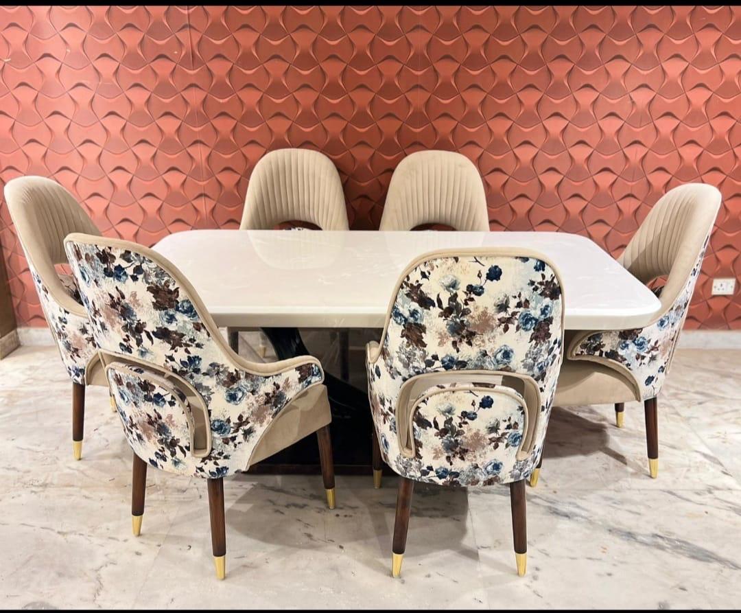 A luxurious marble dining table that blends timeless elegance with modern sophistication, featuring a polished stone surface...