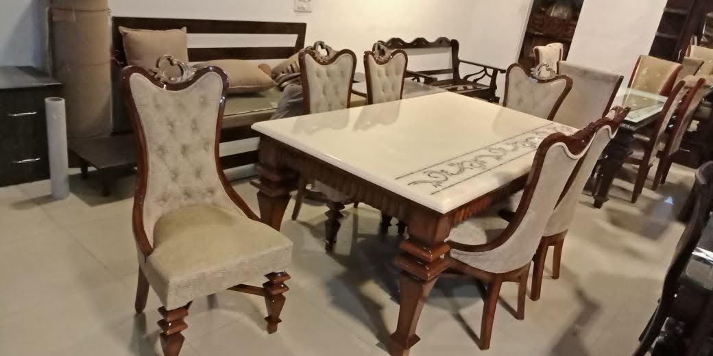 A luxurious marble dining table that blends timeless elegance with modern sophistication, featuring a polished stone surface...