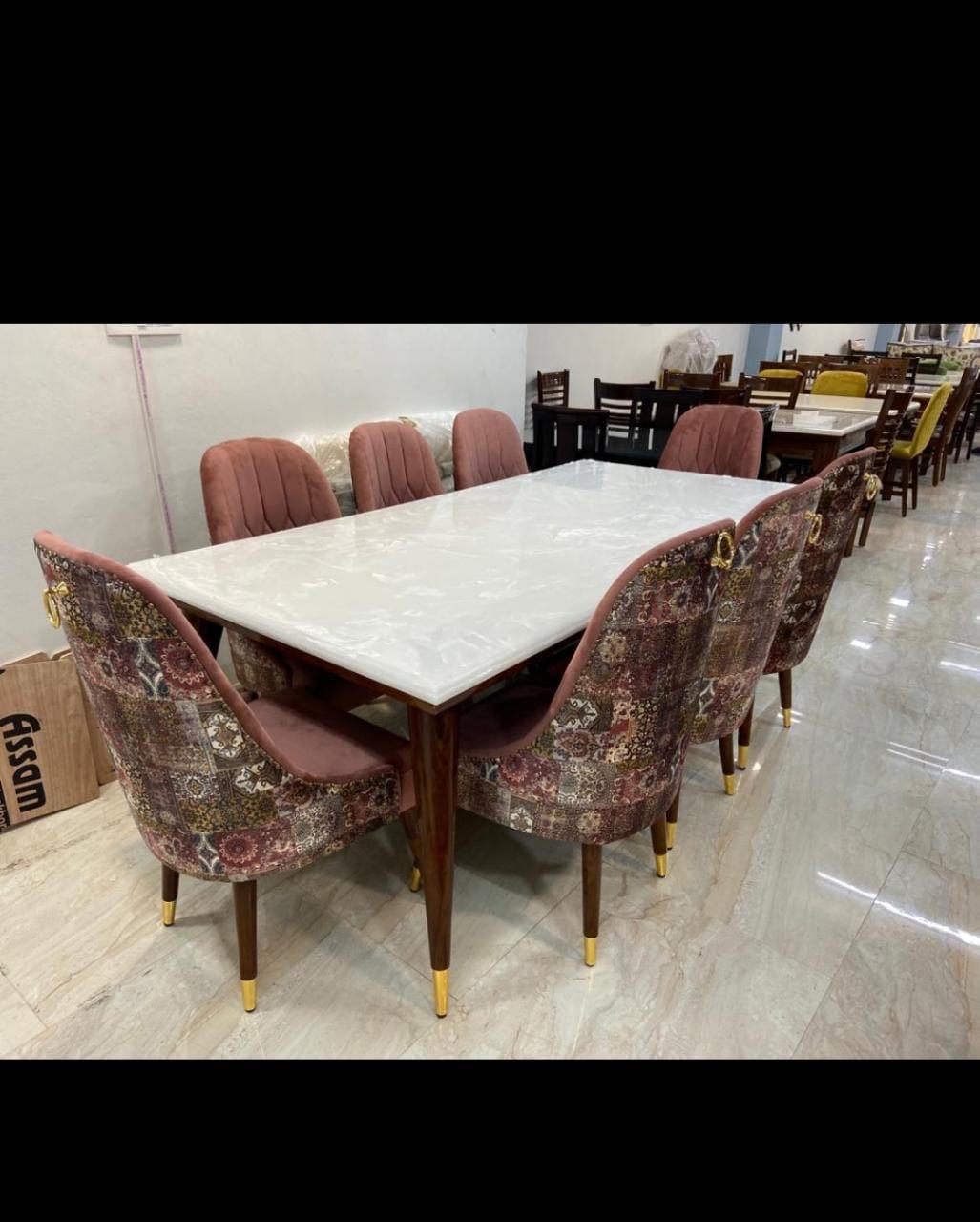 A luxurious marble dining table that blends timeless elegance with modern sophistication, featuring a polished stone surface...
