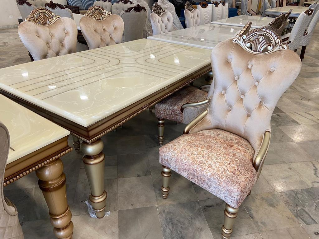 A luxurious marble dining table that blends timeless elegance with modern sophistication, featuring a polished stone surface perfect for refined dining experiences and upscale interiors.